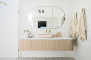 Bespoke curved thermolaminated v-groove cabinetry available in 4 cabinet finish options only.